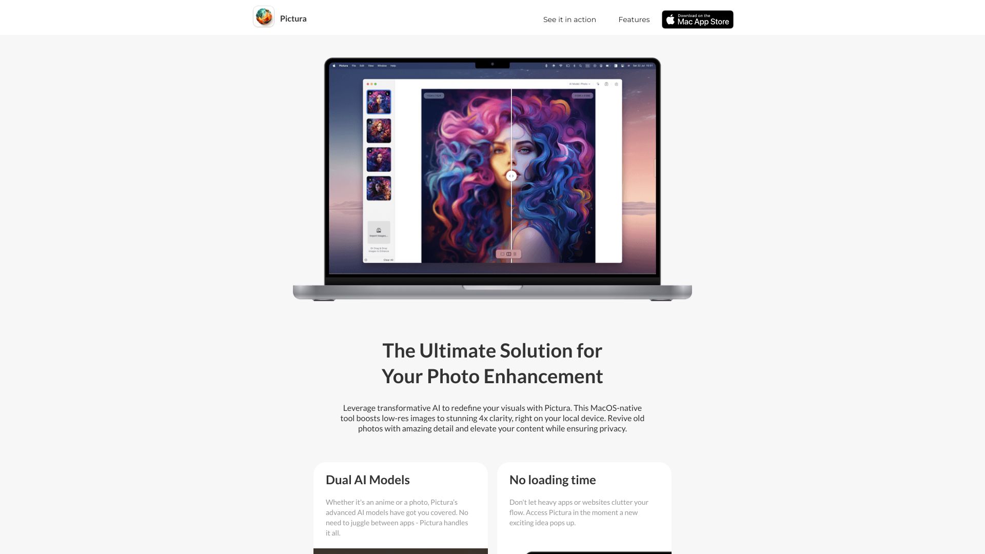 Pictura is a MacOS photo enhancement tool that uses AI to improve image quality.