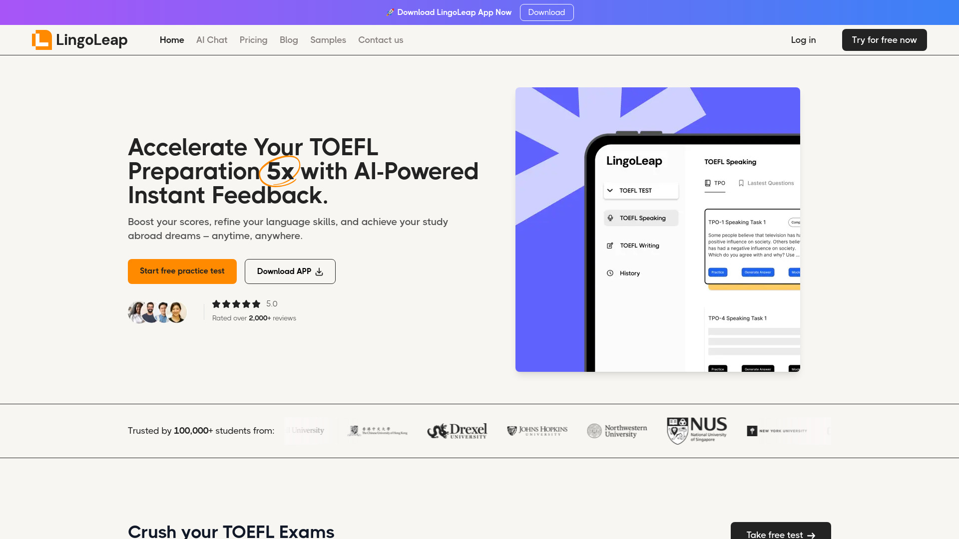 AI tool for TOEFL and IELTS preparation with personalized feedback.