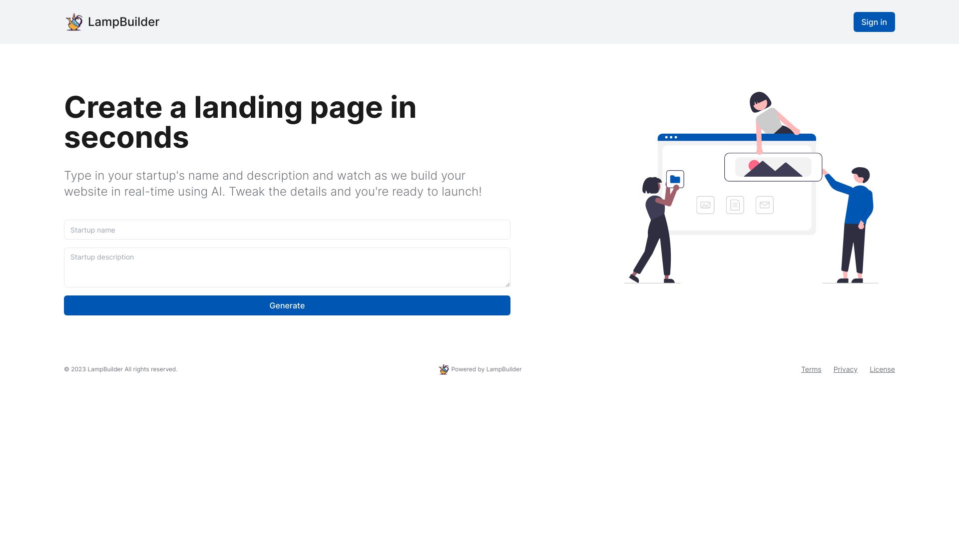 Instantly create stunning landing pages for startups with Lampbuilder's AI-powered platform.