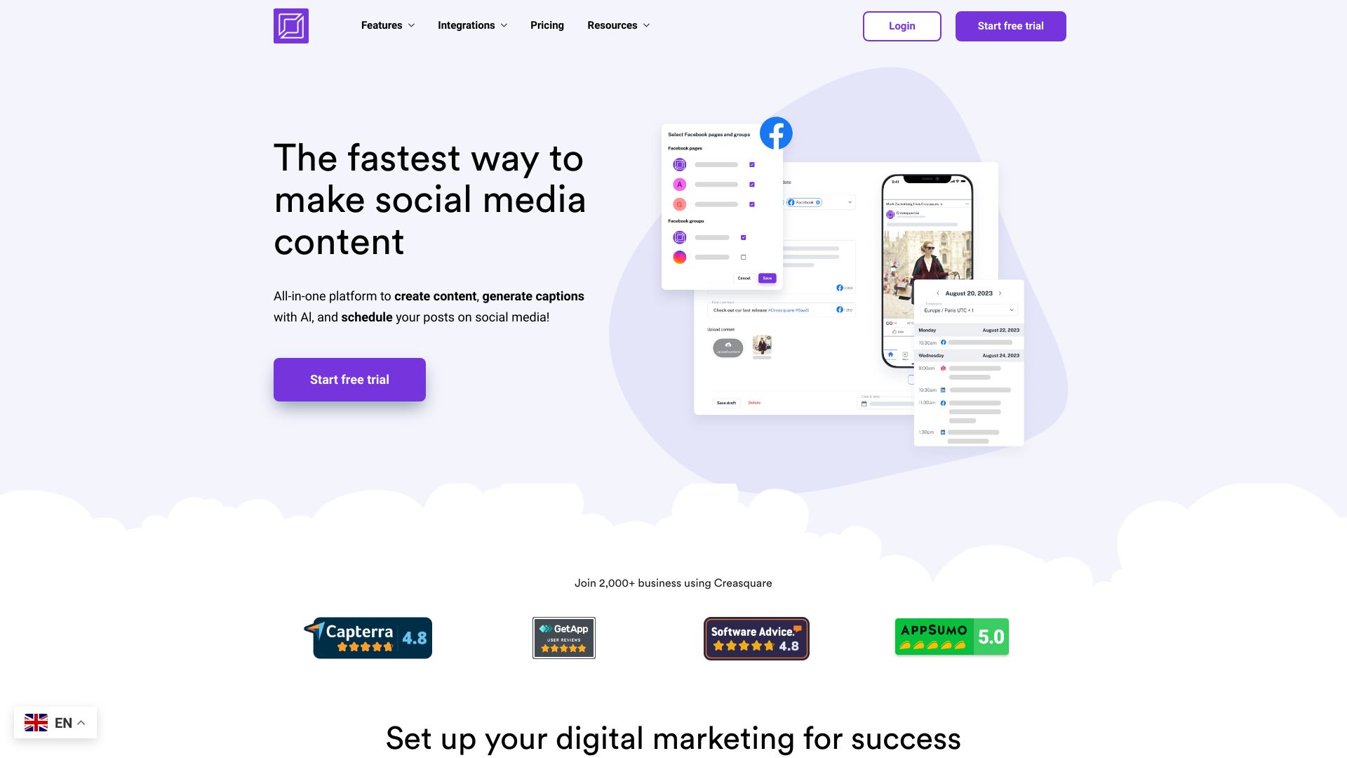 A comprehensive digital content solution powered by AI, Creasquare offers content creation, scheduling, analysis, and social media integrations.