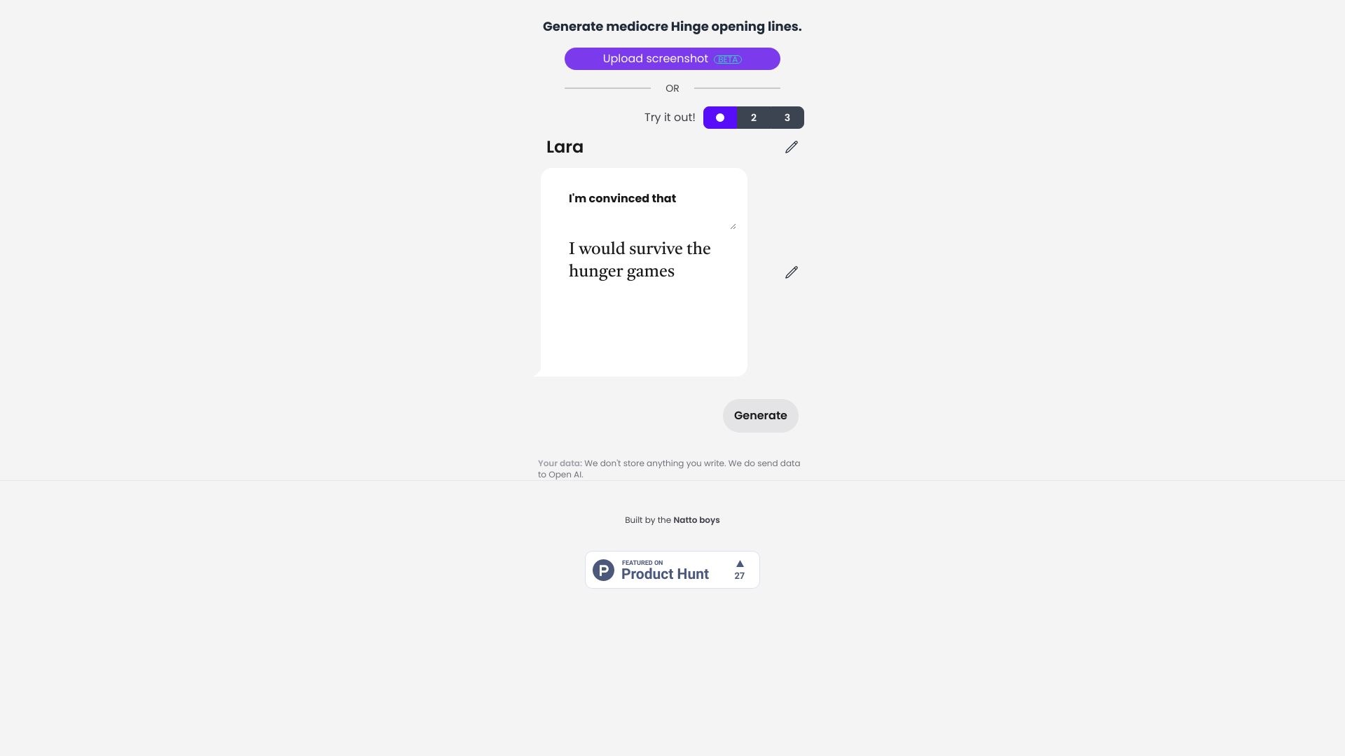 Pikup AI generates Twitter bios and pick-up lines for different settings, helping users create engaging profiles and start conversations.
