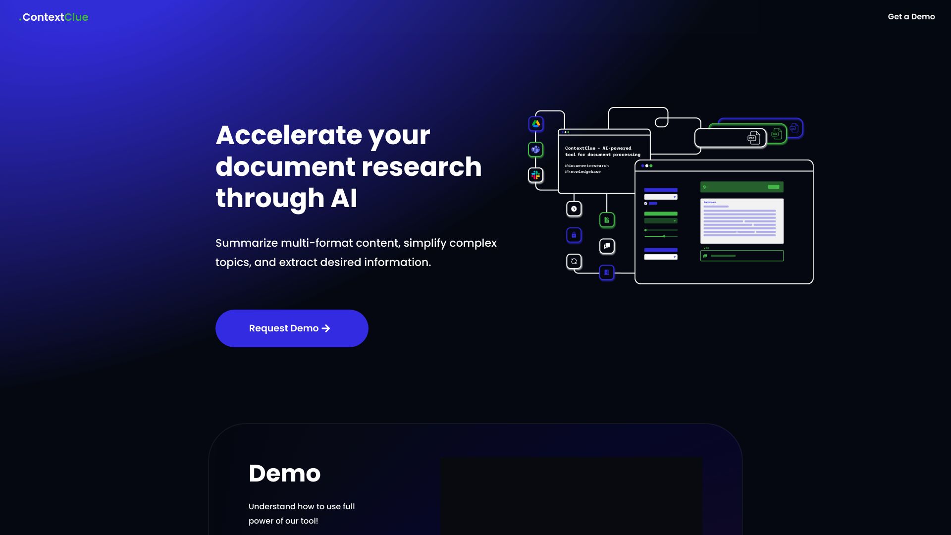 ContextClue is a tool that extracts vital information from diverse documents, including text files, scanned PDFs, and numerical data. Users can interact with a chatbot, ask questions, and receive precise answers.